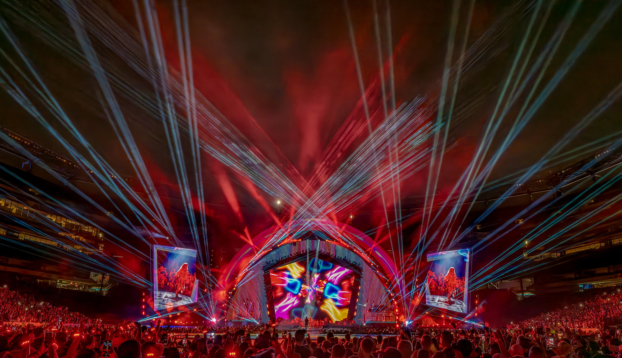 A further 110 Robe MegaPointes; 45 Vari-Lite VL3600s; 134 GLP X5 Bar IPs, 50 X4S and 48 JDC1s; 32 Martin Professional MAC Ultra Washes and eight Performances; 12 SGM G7 BeaSts; eight Ayrton Domino LTs; 13 TMB Solaris Flare Q+s; 22 Astera AX5s and a pair of Astera Titan Tubes made up the lighting package. Atmospherics came in the shape of eight MDG The One hazers, all controlled by an MA Lighting grandMA3 full size console in MA2 mode with a grandMA3 Light for backup.