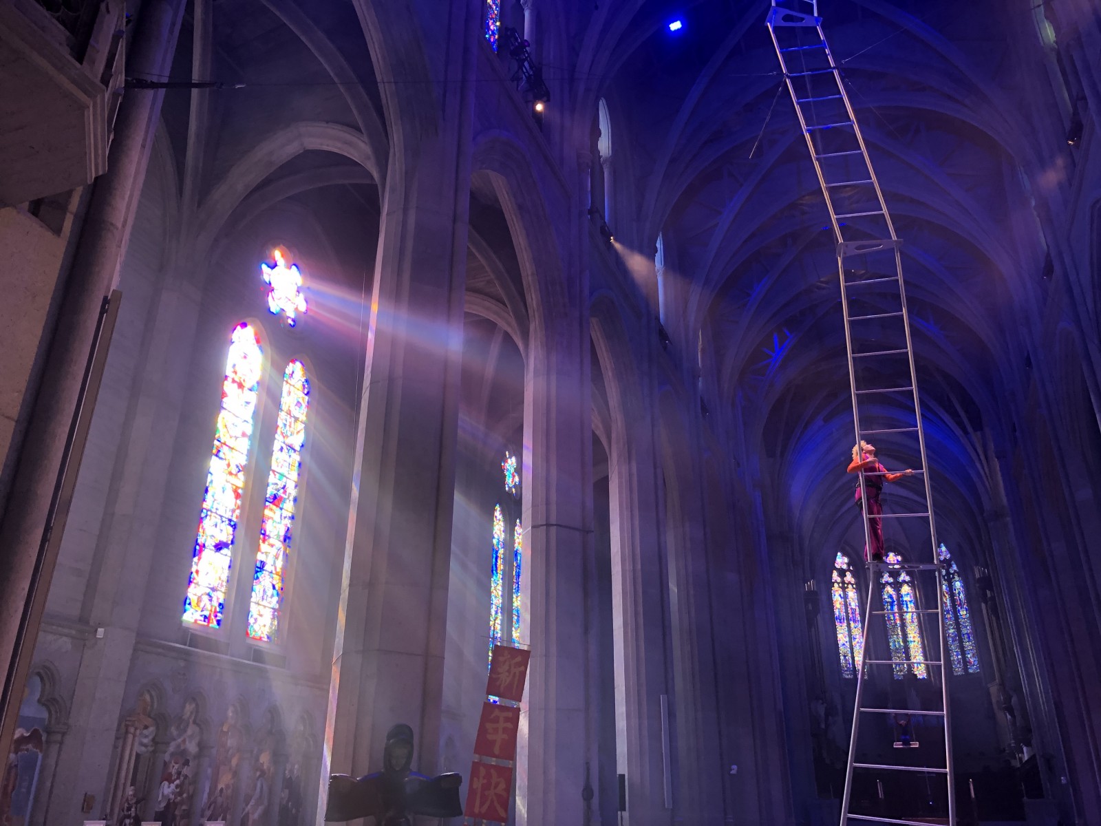 For Freitag, each of the large set pieces presented its own rigging design challenges, the most complex of which was the execution of the "big swing" element which occurs at the top of the show. “The dancer mounts the swing at floor level, clips into a Petzl ‘Rig’ self-belay device, then is lifted via chain hoist (hidden in the gallery level) to 13' up off the floor of the nave,” he explains. “The simultaneous lift of swing and dancer is achieved by resolving both swing and dancer lines to a single clew, fixed to the lifting hook. The swing is then manually pulled back 60' high by two riggers in the grid via a 300’ bridled rope. This hauling line is deaded off on one side of the cathedral at the clearstory level, runs through a floating idler sheave secured to the center back of the swing using a small modified 3-ring parachute release mechanism, then redirected up into the catwalk.