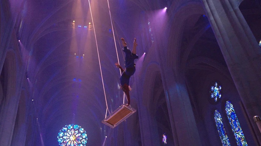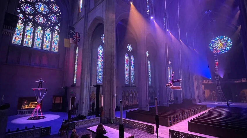 At Grace Cathedral, the set pieces included three towering apparatuses hosting aerial dancers, and each representing different phases of being in love. They were spread through the soaring cathedral: