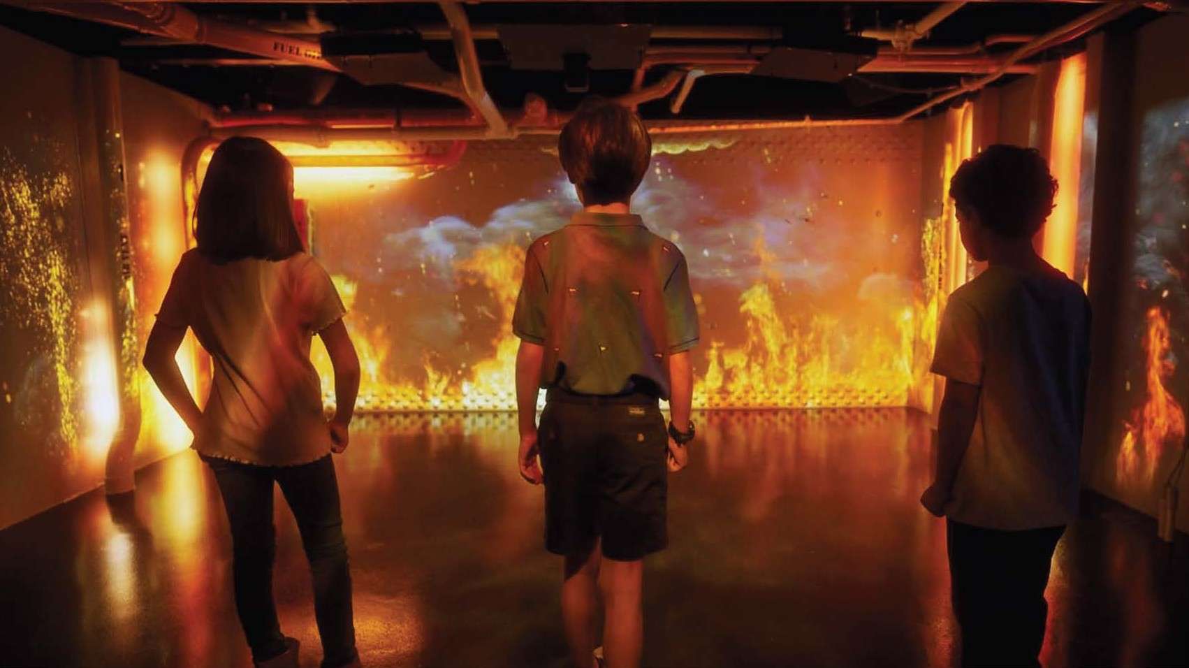 The concept focused on two interconnected exhibits: the engineering experience (covering steam generation, tools, and living) and a simulated fire experience to address the single most dangerous threat aboard any ship.