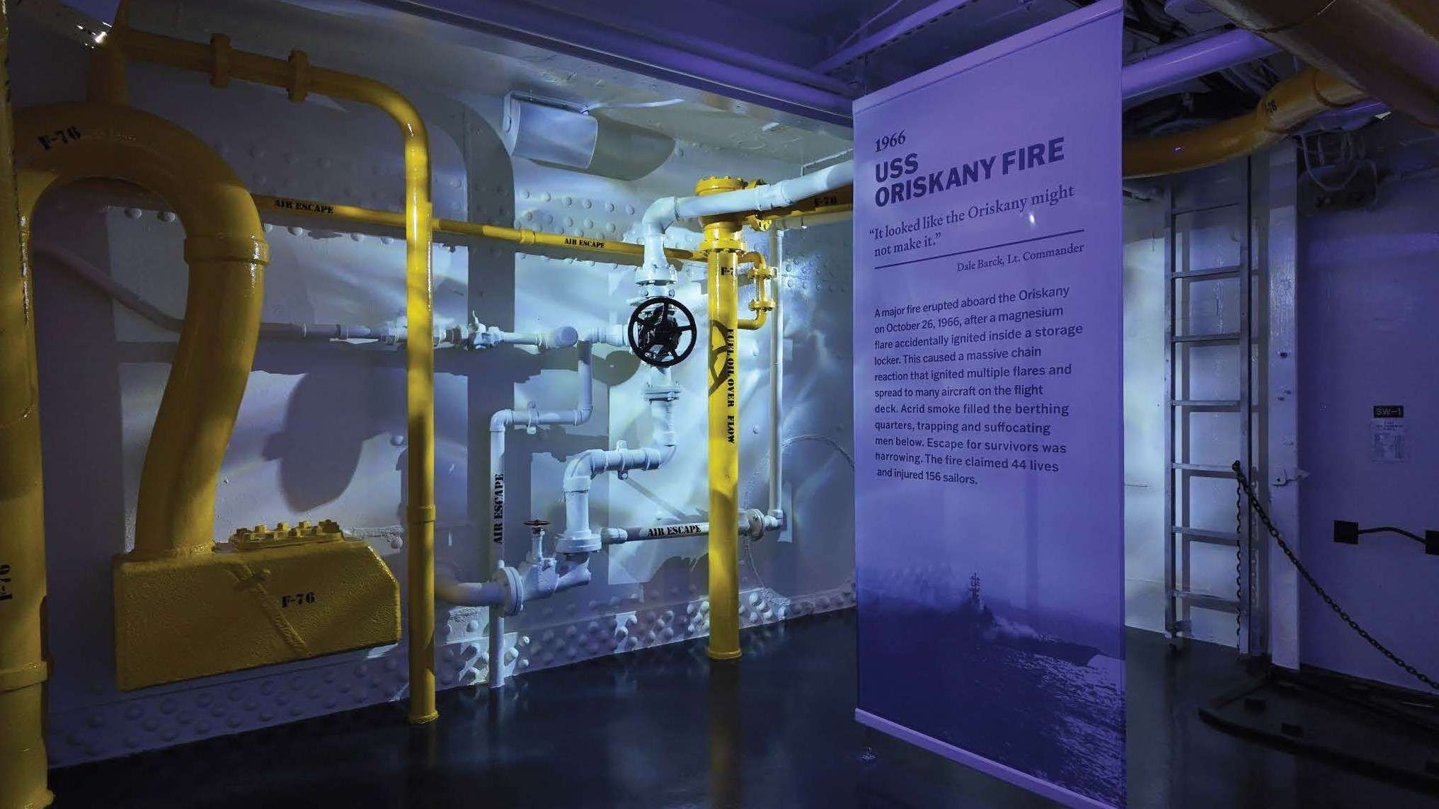 “Saving the Ship,” the final gallery, provides guests a moment to reflect and decompress; Somber music, blue tones, and projected water effects set the background. Scrim screens divide the area, honoring sailors who lost their lives in fire-related incidents aboard the Midway and other vessels.