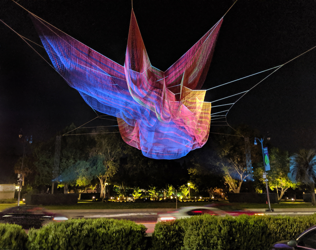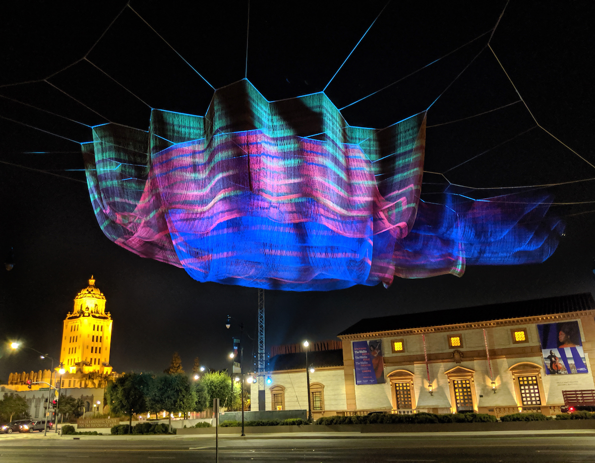 1.78 Beverly Hills, a sculpture in Janet Echelman’s Earthtime Series, was installed in August 2019 between the Wallis Annenberg Center for the Performing Arts and Beverly Gardens Park as part of the city’s annual BOLD Summer festival.