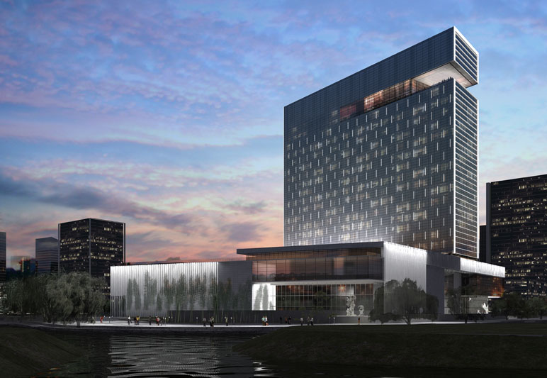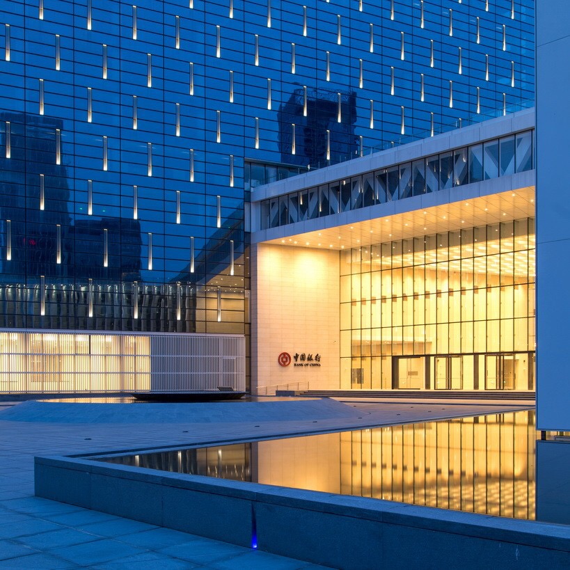 Lightswitch Architectural designed lighting for the complex’s interiors, exteriors, landscape, banking halls and event auditorium to reveal Pei Partnership Architect's signature architecture.