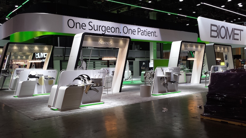 Hamilton Exhibits retained Lightswitch, for the second year in a row, to design the exhibit lighting. Looking to differentiate Biomet from its competitors, the Hamilton Exhibits design team wanted a clean, bright lighting solution that would present Biomet’s products in the best light. We used white LED luminaires and arc sources to highlight the exhibit architecture and illuminate product displays, customizing the color temperature of the light for the best results.