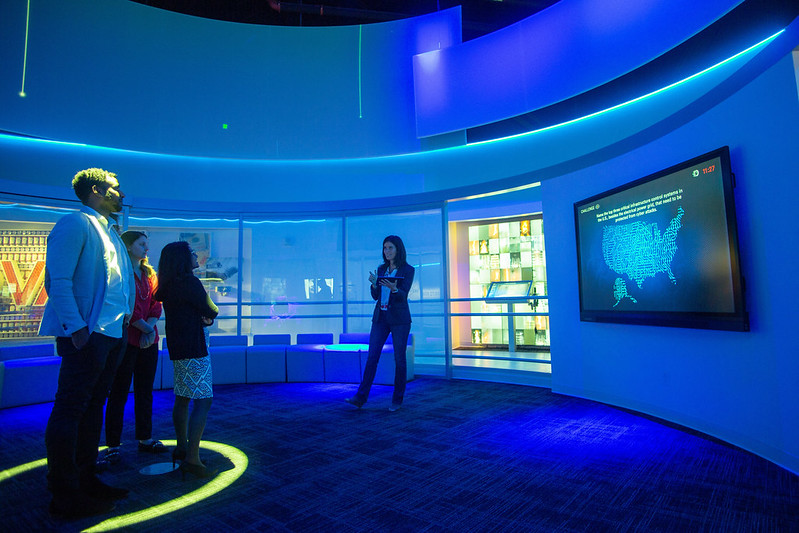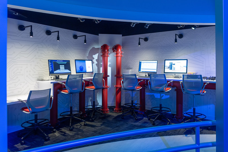 Lightswitch designed the lighting for the entire space, some of it running from iPads, some adjusting in real time from internet data, and some of it static. The training center brought forward the idea for a game consisting of complex, zooming rings of light. Our team identified the type of fixture that would allow for the necessary zoom range and installed it at a height that makes the game approachable and playable by anyone.