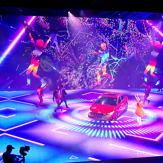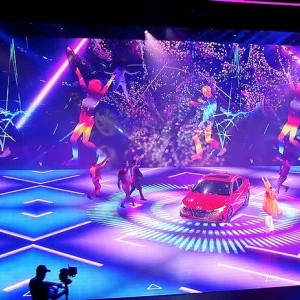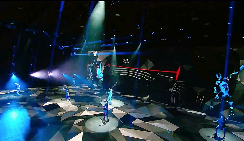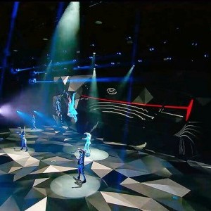 Lightswitch worked with the show’s director and designers to create a highly theatrical and immersive environment for the performers, executives, and vehicles, using lighting to expand the abstract and colorful visuals of the video wall and floor. Triangular designs were a key theme of the vehicle’s design language, so these shapes were used as a motif throughout the media content, and extended into the lighting design as well.