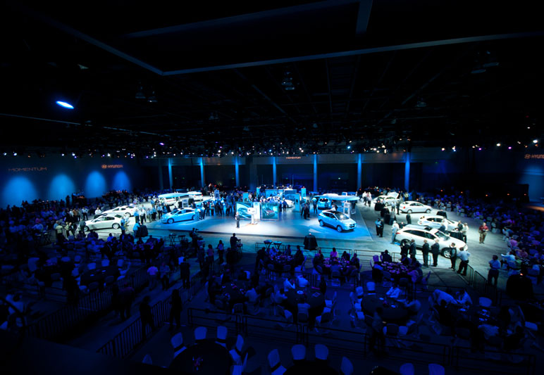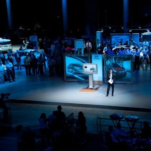 Lightswitch worked with Producers and Designers from Jack Morton Worldwide to take a limited budget and execute a modern and theatrical presentation that could rapidly change into the evening party. Utilizing economic yet flexible tools, the design minimized turnaround costs, while keeping on theme. Lighting was designed to mimic both the real-world lighting conditions desired in the new dealership design, as well as to enhance and extend the “virtual architecture” theme that ran throughout the show‘s video graphics.