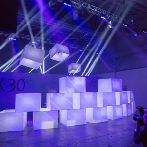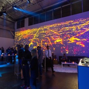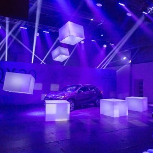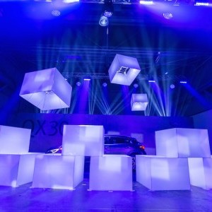 Working with frequent collaborator George P. Johnson, Lightswitch provided lighting and visual design for the product launch and venue. Our goal was to create an exclusive event and environment that would resonate with the car’s target demographic: Young, stylish urbanites across the globe. For the launch, guests watched as a wall of drone-controlled light cubes flew away, one by one, to reveal the QX30. We designed video content and lighting for the reveal and assisted cube designer, fabricator and choreographer Aerial Mob on the shades and lighting for the internally illuminated cubes. Lightswitch also transformed the venue inside and out. Outside, we added vibrant illumination that made the warehouse façade pop amidst the industrial surroundings. Inside, our video projections and light art installations gave the space a hip art gallery vibe. We created abstracted urban images that were projected onto surfaces throughout the venue, while additional media displays showed time-lapse visuals of different cities in real time to emphasize the car’s global reach.