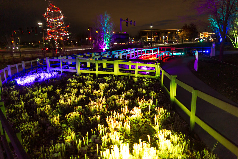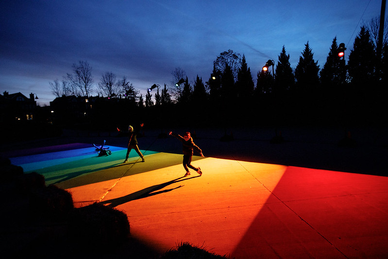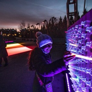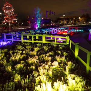 Lightswitch designed an interactive experience that focused on basic color mixing to appeal to children – many of whom would be attending their very first light show. The idea was to make a “kid-sized” version of other beloved local light shows, while increasing the magic factor by allowing children to control their own experiences. Our team concentrated on making the entire installation beautiful through the eyes of a child – approximately two to four feet off the ground. We even had some fun with the set pieces, giving them names such as Pixel Play Meadow, Rainbow Caterpillar, and Color Square Walk.