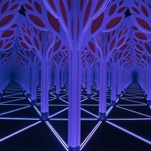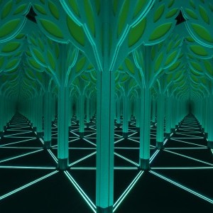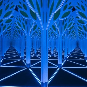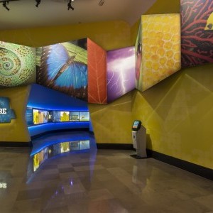Lightswitch Architectural designed the lighting for the entire exhibit, including the mirror maze, entrance, theater, interactive spaces and cases. The exhibit uses only LED sources, a major first for the museum. Fittingly, the project presented a difficult mathematical challenge for us: how to replicate the perfect patterns seen in nature with lighting. We started by integrating RGB LEDs into the floor along the base of the mirrors. Then we illuminated the 3-D trees that line the walls with LED tape. Reflected in the mirrored surfaces, the floor and tree lights create a seemingly infinite field of geometric patterns. The maze alone features approximately 30,000 LEDs, including custom, integrated emergency exit lighting that doesn’t distract from the exhibit lighting. The lamps include wirelessly controlled, individually addressable RGB AW PAR38 lamps that were color tuned to complement the objects they illuminated. We also added projections to the entrance and worked with exhibit fabricators Ravenswood Studios to integrate LED fiber-optic lighting into the cases.