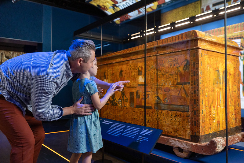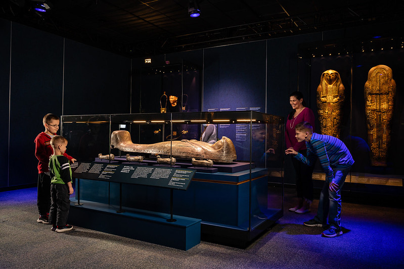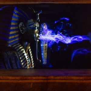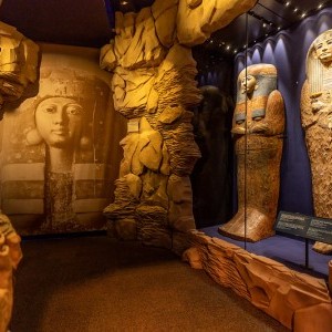 Because of the large amount of video content in this exhibit, Lightswitch was tasked with the challenge of designing lighting that would complement the existing illumination from the screens. Our design involved the installation of LED ribbons into many scenic elements, resulting in the appearance of “floating” objects. Our experience in designing for museums helped us create a strong foundation for the featured videos and other immersive elements. For example, one especially interactive segment demonstrating the ancient Egyptians’ knowledge of astronomy allows guests to press a button to see a simulation of sunlight shining through specific corridors on significant days of the year — thought to correspond to the dates of Ramses’ birth and coronation.