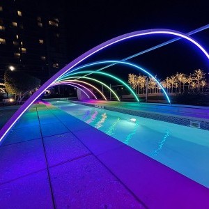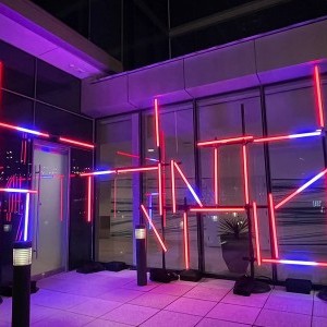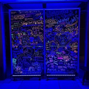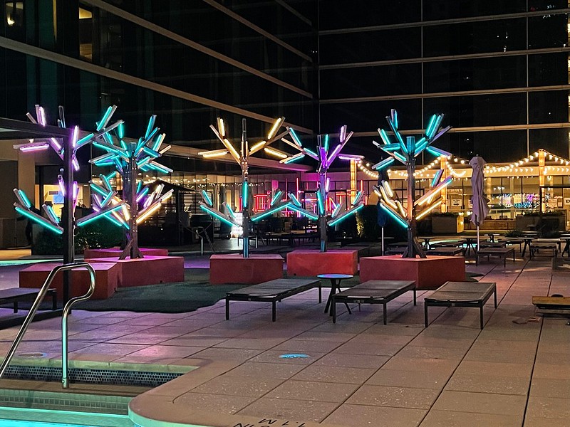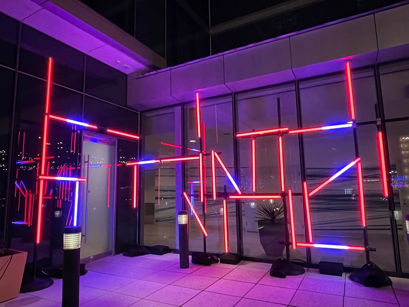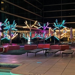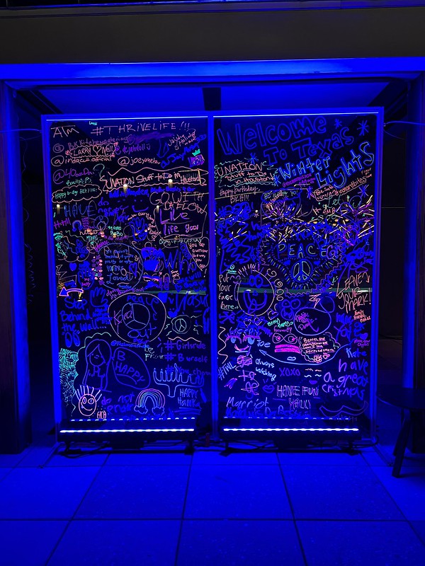 Lightswitch designed Texas Winter Lights for the hotel’s sixth floor, which features a large Texas-shaped lazy river and a balcony overlooking Discovery Green Park. Because this unique pool deck already draws plenty of attention from guests, our team set out to transform the space into a date night-worthy light show experience, complete with a plethora of festooned string lights. Texas Winter Lights ultimately featured over 18 separate areas for guests to explore. These included elements such as custom 10-foot-tall trees covered in LED lights, light tunnels spanning the lazy river, and a plexiglass wall that guests could draw on from either side.