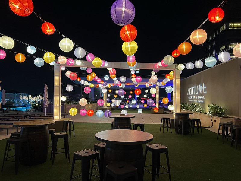 The show also featured a DJ and dance area. In an effort to attract the public from Discovery Green, Lightswitch installed giant searchlights that moved in time with the DJ’s music, enticing passersby. Our team’s installations combined with the hotel’s hospitality to yield a truly festive experience — one that included everything from Christmas movie nights to a relaxing “serenity area” in the infinity pool.
