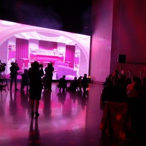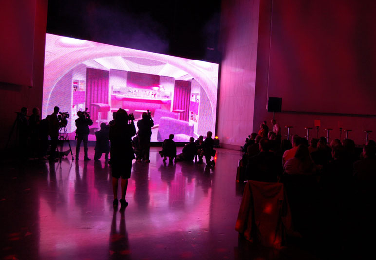 Event producer Paulette Wolf Events and Entertainment turned to Lightswitch for complete creative event design. Lightswitch not only conceived of the reveal, but also coordinated the production of media and graphic elements for the event. A low-resolution translucent video screen was used not only to display video material but also to create a surprising reveal of a cabin mock up. Lighting was used to transform the Rotunda of the museum into a magical cathedral of light.