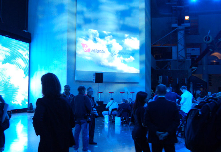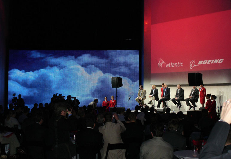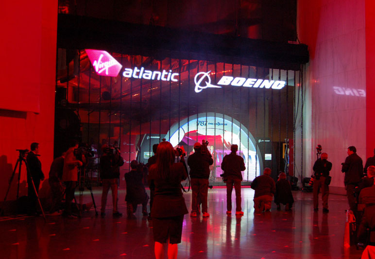 Virgin Atlantic and Boeing wanted a surprising and high tech presentation to announce Virgin’s order for Boeings new 787 ‘Dreamliner’. Appropriately for a technology-focused event with a forward-looking message, the event was staged in the central Rotunda at The Museum of Science and Industry, Chicago.